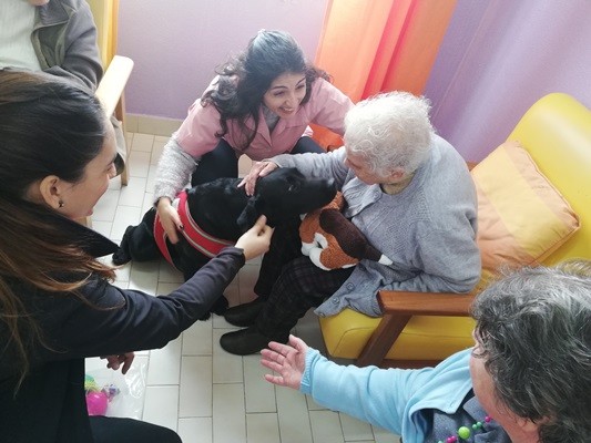 Depois visitaram o Centro de Dia, onde reunimos alguns utentes para uma dinâmica de grupo. Para este exercício os utentes tinham de identificar os alimentos mais ou menos adequados à alimentação do animal, podendo depois alimentá-la. O entusiasmo esteve presente durante toda a sessão. Todos tiveram a oportunidade de interagir com a Indie, brincar com ela, dar-lhe comida, atirar a bola,… proporcionando a todos momentos de grande diversão.