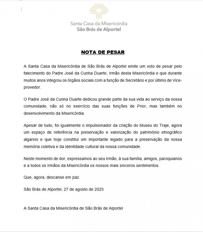 A Santa Casa da Misericórdia de São Brás de Alportel emite um voto de pesar pelo falecimento do Padre José da Cunha Duarte, Irmão desta Misericórdia e que durante muitos anos integrou os órgãos sociais com a função de Secretário e por último de Vice-provedor.