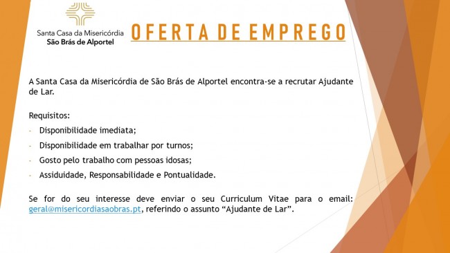 A Santa Casa da Misericordia de São Brás de Alportel encontra-se a recrutar Ajudante de Lar.